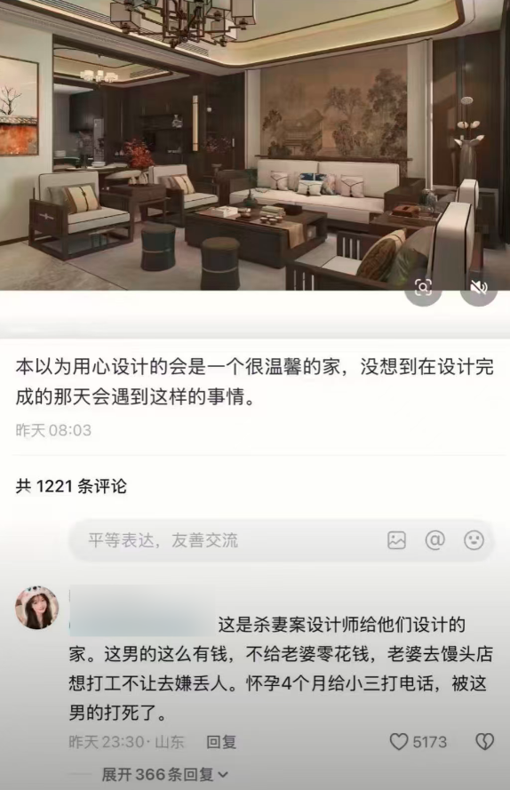 曾给刘某某设计房子的设计师也发声了,称本以为用心设计的会是一个很温馨的家,没想到在设计完成的那天,会遇到这样的事情。从晒出的设计图来看,新中式的风格十分漂亮,也能看出男方家里财力过人。