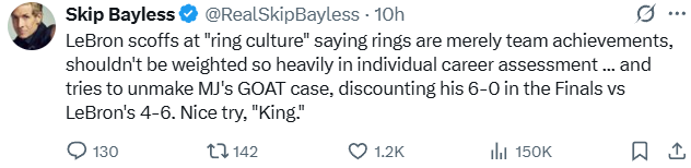 他表示:“詹姆斯对戒指论嗤之以鼻,称总冠军只是团队成就,不应过度影响个人历史地位评估,他试图瓦解乔丹的史上最佳论证,淡化乔丹总决赛6胜0负的完美战绩与自己4胜6负的对比,这番狡辩着实可爱啊。”