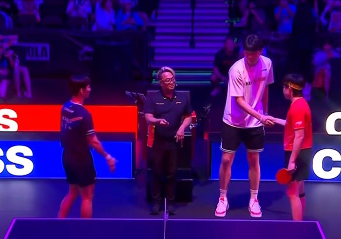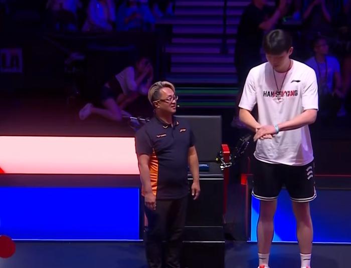 入场后,最萌身高差就出现了。毕竟杨瀚森是篮球运动员,还是内线球员。反观乒乓球球员的身高相比于篮球运动员来说都不是很高。当然以前杨瀚森就练过乒乓球,幸好他没有坚持下去。如果继续打乒乓球的话,这样的身高太过夸张了。后续杨瀚森还和双方进行了握手,展现了礼仪。